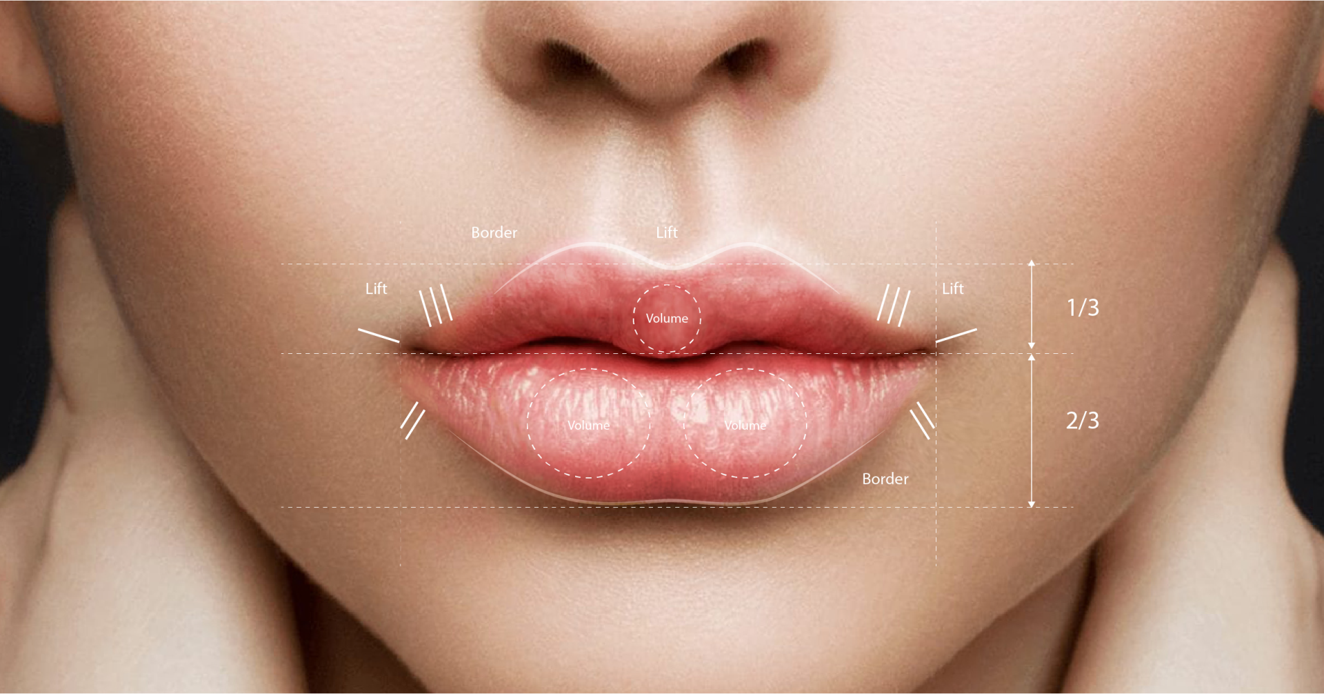 ○ โดยปกติขนาดของริมฝีปาก บน:ล่าง ที่เหมาะสมคือ 1:1.6 หรือ ปากบน 1/3ส่วน ปากล่าง 2/3ส่วน ถือเป็น’สัดส่วนทองคำ’ ของใบหน้าและริมฝีปาก เป็นหลักการสำคัญสำหรับการฉีดฟิลเลอร์ปาก