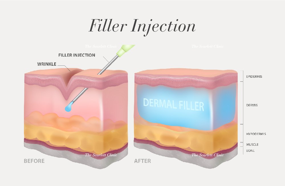 ฟิลเลอร์ คือ สารเติมเต็มแบบชั่วคราว ( Hyaluronic Acid หรือ HA ) ที่ได้รับการรับรองโดย อย.ไทย และสากล US.FDA นำมาใช้ในการเติมเต็มริ้วรอย และร่องลึกให้ตื้นขึ้น โดยมีอายุการใช้งานเฉลี่ยอยู่ที่ประมาณ 8-12 เดือน และมีความปลอดภัยค่อนข้างสูง ช่วยเพิ่มปริมาตรเนื้อเยื่อให้กับชั้นผิว เสมือนเป็นการเพิ่มขนาดโมเลกุลใต้ผิวให้อุ้มน้ำตามจุดต่างๆ ช่วยเติมเต็มหรือเสริมชั้นในผิวหนัง ช่วยแก้ไขปัญหาริ้วรอยร่องลึก และปรับรูปหน้าบริเวณต่างๆ ให้ดูอ่อนเยาว์ขึ้น