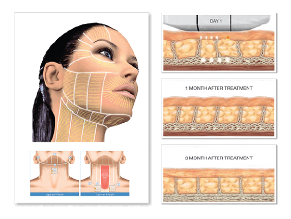 The Ultherapy® procedure stimulates collagen production by delivering focused ultrasound energy to the skin’s foundational layer typically addressed in cosmetic surgery—without cutting or disrupting the surface of the skin. Unlike lasers, radio frequency, surgery and other technologies, non-surgical Ultherapy bypasses the surface of the skin to deliver the right amount of ultrasound energy at the right depths and the right temperature. This energy triggers a natural response under the skin, jumpstarting the regenerative process that produces fresh, new collagen.