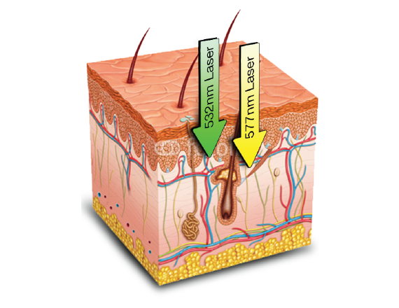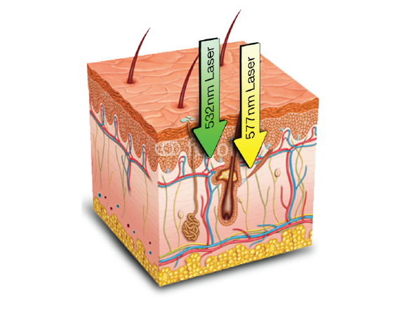 Pro Yellow 577 nm ส่งพลังงานลงได้ ลึกกว่า! เลเซอร์สีเขียวมาตรฐาน (532 nm)